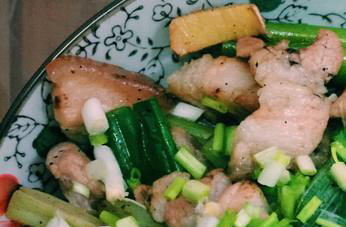第一步:大葱切片,肉切片后简单用盐腌制下。