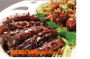 第六步:蒸好的海参肉摆好盘,淋上烧热的调味汁即可。