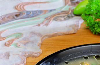 第四步:牛肉剁成肉块,放入汤中搅拌均匀后再煮上两分钟即可放入盐。