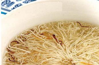 第七步:锅中最后放入豆腐丝,等到豆腐丝慢煮开漂浮在鸡汤至上,加入味精调味。