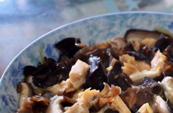 第二步:木耳香菇洗干净之后切丝,在水中汆烫下。