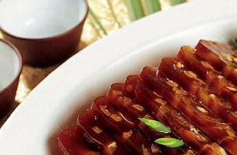 4、等锅中的肉皮全部熟透软烂以后,汤汁也会变得浓稠,这时关火取出放在容器中冷却,等它完全降温以后,自制的冻肉就能做好,想吃时取出,切成小块,然后加入适量的蒜泥和香醋以及香油调匀直接食用即可。
