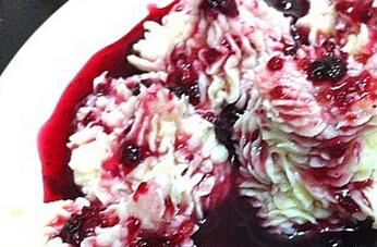 4、把熬好的蓝莓果酱中加入蜂蜜调匀,再直接浇在做好的山药泥上,一份既好看又好吃的蓝莓山药也就做好可以食用了。