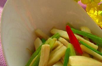 2、把杏鲍菇和香芹全部切成细丝的样子,把大蒜去皮以后也切成丝状,在炒锅中放油加热。把大蒜放入炒出香气随后把杏鲍菇丝和芹菜丝放入炒制。