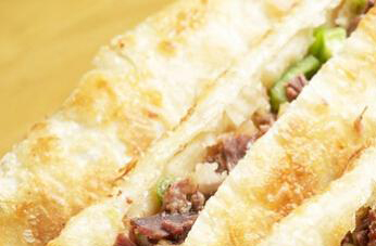 4、把电饼档接通电源,放适量的食用油,把火烧放入锅中煎制,煎到两面金黄以后取出,从中间切开装盘,香喷喷的驴肉火烧就可以食用了。