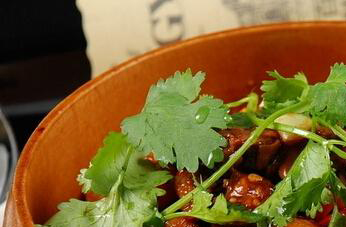 2、把花椒放在碗中加入适量清水泡成花椒水备用,把香菜洗好以后切段,再把葱姜全部切成片状备用。