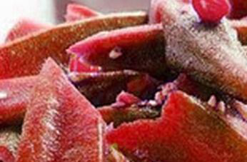凉拌红秋葵也是红秋葵的常见吃法,在制作以前要先把红秋葵从中间切开,锅中放水加少量食用油和盐烧开,然后把红秋葵放入煮制三分钟,取出用冷水降温,再切成小块,然后加入蒜泥和食用盐以及香油和生抽等调味料调匀装盘就能食用了。