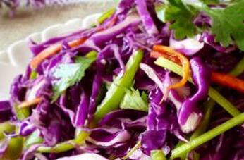 凉拌紫甘蓝特别好吃,制作时把洗好的紫甘蓝切成细丝,然后再取一个彩椒也切成细丝,把彩步和甘蓝丝加入食用盐腌制一会,把腌出的水分去掉,再加入香醋,生抽以扩白糖和麻油等调味料,调匀以后直接食用就可以。