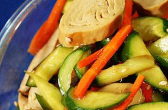 素鸡有多种不同的吃法,它既可以炒食,也能凉拌,还能制成卤素难供人类食用。其中凉拌素鸡是最常见也最简单的一种吃法,在制作时可以把素鸡切成片状放在开水中焯一下,取出以后降温去掉水分,再与黄瓜丝葱丝等放在一起,加入生抽和香醋以及适量的食用盐与味精调匀以后就能食用。