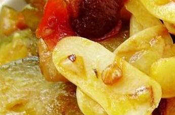 2、把炒锅中放入色拉油,加热到八成热时把茄子块放入炒制,等茄子变软以后再取出来放在盘子中。