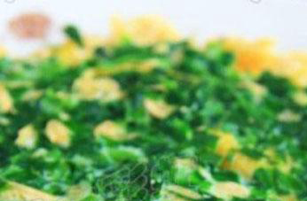 3、往平底锅中加入一层油,不用太多,然后将玉米面糊均匀的摊在锅中,压平,将剁碎的韭菜馅均匀的洒在玉米饼上,再次摊平。盖上锅盖,用小火将玉米面包烙熟,等待大概五分钟左右,揭开锅子,如果看到玉米面包的底部有些发黄,就说明可以出锅了。这样一个完整的韭菜糊饼就制作完成了,掌握好小窍门,其实并不难哦。