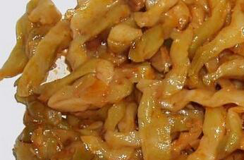 2、把准备好的榨菜切成细丝以后用开水焯一下,去掉水分,然后把准备好的调味料和其他材料全放进去,调匀以后加入香油提味,,腌制半小时以后就能食用。
