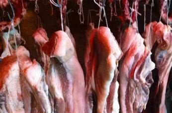 4、腌制五天以后,把肉翻动一下,再用重物压好,接着腌制五天,腌好以后取出,把肉悬挂在阴凉通风的地方晾干。