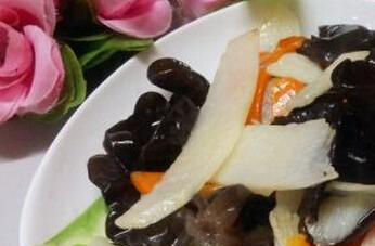 3、把锅中放油加热以后放入葱花,再加入山药和胡萝卜炒制,一分钟以后加入少量水,烧开以后加入黑木耳,最后放盐和鸡精进行调味,然后装盘就可以。