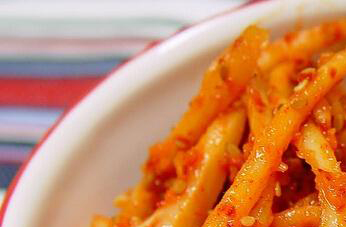 3、把准备好的白芝麻放在锅中炒熟备用,把盐、味精和辣椒粉放在一起调匀,再放处理好的桔梗中调匀腌制,过三四个小时桔梗就能入味,在食用以前把芝麻加入调匀就可以。