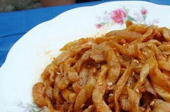 2、把晒好以后的干萝卜干用开水浸泡一下,然后再清洗干净,取出以后沥掉水分,放在通风的地方晾凉以后备用。