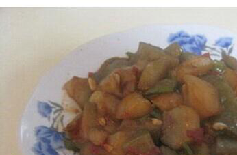 3)一边炒一边加水,直到茄子炒得特别软为止。当茄子变软了,就可以做下一步了,把尖椒丁放入锅内翻炒,一定要炒得均匀才行。