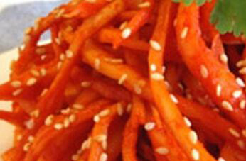 3、把调好的料汁放入到桔梗丝中,调匀密封起来放入冰箱进行腌制,过两三天就能腌透,可以取出食用,在食用以前取一些熟芝麻撒在咸菜上,调匀以后就可以食用了。