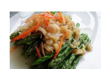 1)干贝是一种海产品,是很不错的一种干货,所以说我们在煮干贝之前是一定要先泡发的,现在我们就先用清水来泡软干贝,然后再把红彩椒切成细丝备用。2)再把芦笋的老皮去掉,然后再清洗干净,再切成长段,再加入一些盐和油,然后再在开水中焯熟再备用。3)再把水放进碗里,再把干贝放进去,再用勺子不断地型号,把干贝弄成丝,然后再把调味料加进去,再倒进行水淀粉中,然后再煮至粘稠。