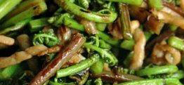取新鲜的猴腿菜国税切段,同时准备好切好的肉丝。在肉丝中加入酱油、淀粉、料酒等作料进行腌制,大概五分钟的时间比较合适。先炒肉丝,再加入猴腿菜。调味出锅,味道新鲜味美。