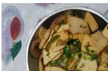 4)然后再把腊肠切成片,再加进竹笋里面,这样炒起来,就会散发出一种腊肠所特有的香味,特别的香,也很可口。