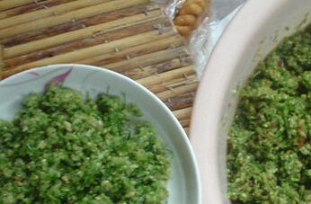 3、把剁好的韭菜花和生姜末放在一个盆子中,加入盐和碱面进行搅拌,调匀以后加盖密封起来,每天搅动两次,过一星期以后就能取出食用了,记得在取食时不要带入生水,存放在冰箱的冷藏室中,就能保存一个冬天不变质。