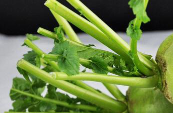 1、在腌制东北青萝卜时,要先把它的萝卜缨子取下来,去掉上面的叶片,只留下杆部,并用清水冼干净,备用。