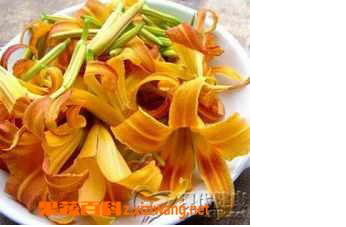 黄花菜,又名金针菜、萱草、忘忧草,为百合科植物,在我国已有二千多年的栽培史。它的花蕾,也就是黄花菜,自古以来就是一种美食。因其花瓣肥厚,色泽金黄,香味浓郁,食之清香,爽滑,嫩糯,常与木耳齐名,均为“席上珍品”。黄花菜的营养价值很高。据分析,每百克含蛋白质14.1克,脂肪1.1克,碳水化合物62.6克,钙463毫克,磷173毫克,以及多种维生素,特别是胡萝卜素的含量最为丰富,干品每百克含量达3.44毫克,在蔬菜中名列前茅。对人体健康,特别是胎儿发育,甚为有益,因此,可作为孕妇、产妇的必备食品。