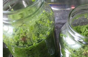 3.接下来再去把一些嫩姜清洗干净以后再切成大片,然后再把姜放进绞肉机里面绞一次,然后再把韭菜花泥和姜撒混合好再加上适量的盐再搅拌好,再把这些韭菜花酱的混合材料一起放进干燥又干净的玻璃瓶子里面,再在瓶子口上面再加上一尾保鲜膜,再盖上盖子,这样不可以密封好了,放在阴凉的地方,放半个月到一个月就可以吃韭菜花酱了。