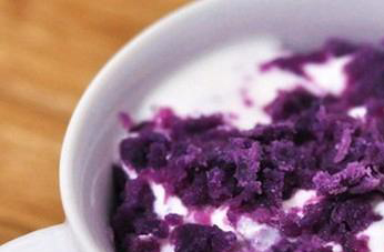 2、把紫薯蒸熟后压制成泥加入少量的牛奶调匀后存入冰箱冻三到四小时后取出。在食用以前在紫薯泥上淋上适量的酸奶就可以。