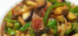 主料:茄子3个。西红椒,菜椒,少量肉丁。