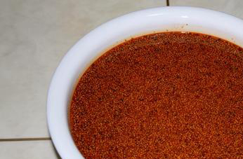 这些调料最好磨成碎末和辣椒面放在一起(如果没有条件就用凉水把这些配料侵泡,作用是让调料充分出味。)