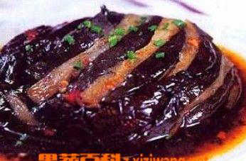 (3)上笼蒸30--35分钟,扣入盘中,原汁勾水粉芡,淋点明油在茄块上即成。