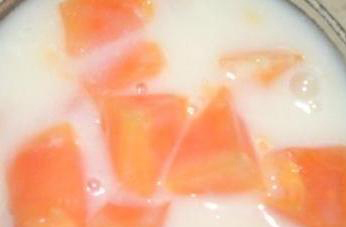 3.至木瓜块煮熟,变色(变成橘红色)盛起;盛有木瓜的碗中倒入牛奶,搅拌即可食用。