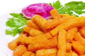 7、当咸蛋黄炒出泡沫时再放入炸好的南瓜条,调入1/2茶匙盐和白糖,推匀即可出锅。