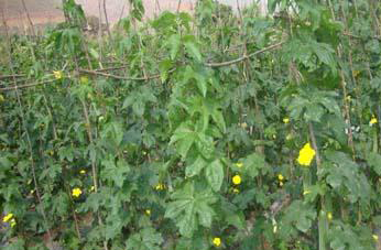丝瓜又叫天丝瓜,也叫天罗、布瓜、蛮瓜。因此瓜的叶,大如蜀葵却多叉,叶尖有细毛刺,它的茎上有棱。六七月开五瓣的黄花,有些像黄瓜花,丝瓜比黄瓜稍大些,因它老时丝很多,所以叫丝瓜。