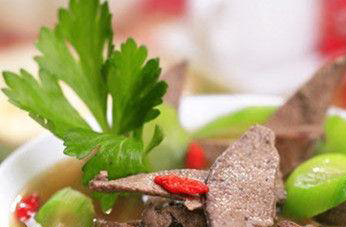 2放入碗中,加入料酒、精盐、水淀粉腌制备用。3、猪肝放入开水里煮熟捞出备用。4、将绿豆洗净放入汤锅中加水适量,盖上盖置武火上烧沸后再煮5~6分钟,然后将绿豆沥出不用。5、丝瓜刮皮、洗净,6、丝瓜切薄片,备用。枸杞洗净备用。7、将绿豆水捞出,一定要还是绿色的这样标明维生素没破坏。8、绿豆水与高汤的比例是2比1。9、倒入绿豆汤和高汤后烧开。10、放入焯好的猪肝煮开。11、依次放入丝瓜、姜片,12、加入精盐、麻油、枸杞搅匀起锅装碗。猪肝含有丰富的铁、磷,它是造血不可缺少的原料,猪肝中富含蛋白质、卵磷脂和微量元素,有利于儿童