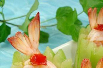2、丝瓜切断,中间挖去,把肉塞在丝瓜里,上面放上一个虾仁。