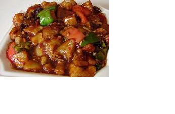 4、锅内放入两勺油,先爆辣椒和蒜,再放入肉丝炒至变色,然后放入炸好的茄子,加酱油、糖、酒和少许调味后,出锅盛盘。