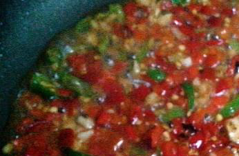 2、锅中放少许油,放入大蒜末、郫县豆瓣酱翻炒出味后放入青红椒炒半分钟;