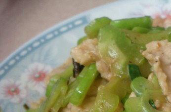苦瓜炒腊肉,其中的腊肉一定要选用新鲜的四川腊肉才香。