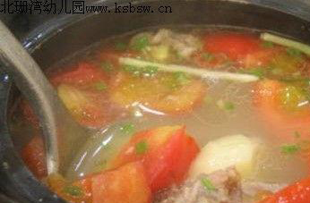 番茄排骨汤。小排500克、番茄250克、番茄酱40克(最好用罐装番茄酱,味道更纯,而不要用番茄沙司)。排骨汆烫后,加适量开水,放入姜片、排骨、料酒。待排骨烂熟时,再加入番茄、番茄酱、盐,再炖上一会就可以关火盛出了。