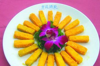 用料:南瓜500克,咸蛋黄2只。 做法:南瓜去皮切成条状;咸蛋去壳取出蛋黄蒸熟,将蒸熟的蛋黄压碎加生油搅匀,铲成蛋黄酱;南瓜条落镬,用中油温炸熟,捞起;用铲好的蛋黄酱落镬爆香,加入南瓜条炒匀即可。 特色:甘香酥软,美味可口。 教路:注意炸南瓜条的火候,要炸透,稔度要适中。