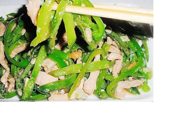 放入甜青椒翻炒出香味,然后调入适量生抽、精盐、煸炒一下。
