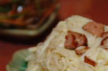 3、大葱一根,切成寸许长的葱丝。生姜适量,同样切丝备用。