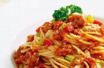 材料:意大利面、番茄酱、番茄(切小丁)、肉末(猪肉、牛肉馅均可)、洋葱(切丝)、土豆(切小丁)、胡萝卜(切小丁)、青豆、蘑菇、甜玉米粒(可放任意喜欢的蔬菜比如青椒、西兰花、荷兰豆等)