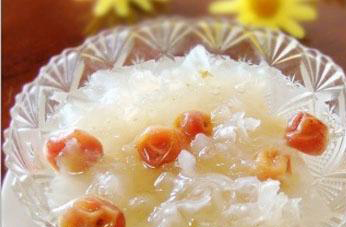 银耳又是席上珍品佳肴和滋补佳品。用冰糖、银耳各半,放入砂锅中加水,以文火加热,煎炖成糊状的“冰糖银耳汤”,透明晶莹,浓甜味美,是传统的营养滋补佳品;用银耳、枸杞、冰糖、蛋清等一起炖制的“枸杞炖银耳”,红白相间,香甜可口,具有较强的健身功能;用银耳与大米煮粥,也是别具风味的营养佳品。
