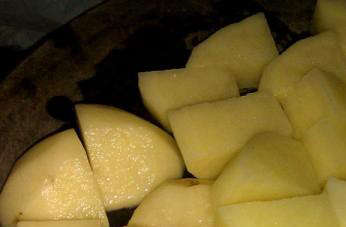 去皮后的土豆切成小块,在冷水中浸半小时以上,使残存的龙葵素溶解在水中。