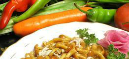 素炒块根蘑 一、原料: 1.主料:鲜块根蘑 500 克,笋片 50 克,青菜心 50 克。 2.调料:精盐、味精、酱油、葱花、猪油。二.制法: 1.将块根蘑去杂洗净切片。青菜洗净切段。 2.油锅烧热,放入葱花煸香,投入块根蘑煸炒几下,加入精盐、酱油煸炒,加入笋片、青菜煸炒至入味,点入味精推匀,出锅装盘。 按:块根蘑味道鲜美,可为人体提供蛋自质、碳水化合物、多种矿物质、多种维生素等营养成分。与健胃消食、利眼下气的笋片和解毒除烦、通利肠青的青菜组成此菜。对于大小便不利、身热口渴、胃肠胀满等有一定疗效。 块根蘑炒肉片 一、原料: 1.主料:鲜块根蘑 250 克,猪肉 200 克,笋片 50 克。 2.调料:料酒、精盐、味精、酱油、白糖、葱花、姜丝、湿淀粉。 二、制法: 1.将块根蘑去杂洗净切片。猪肉洗净切片。 2.锅烧热,投入肉片煸炒至水干,烹入料酒。酱油煸炒几下,加入葱姜、精盐、白糖,炒至肉片熟,投入块根蘑继续煸炒至入味,用湿淀粉勾芡,点入味精推匀,出锅装盘即成。 按:块根蘑炒肉含有丰富的蛋白质、脂肪等营养成分,猎肉具有滋阴润燥、补肾阴、补虚的功效。笋片具有利隔爽胃的功效。可用作瘦弱、干咳、便秘及营养不良等病症的食疗菜肴使用。
