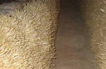 将灭菌后的栽培袋趁热搬进无菌室散放,让其冷却,这样栽培袋由于骤冷而紧缩,栽培中料袋侧壁就不会长菇而消耗培养料的养分。将冷却后的栽培袋放在接种箱内接种,然后转到暗室中培养,促进菌丝迅速生长。因制袋是在月平均气温只有15℃ 左右的2月进行的,而金针菇菌丝生长又需要较高温度,所以应将菌袋互相靠紧排列在培养架上,天气寒冷的夜间还要覆盖塑料薄膜,使菌袋间温度保持在15-25℃,此外,每天下午2时左右室内要通风1小时,以降低二氧化碳浓度,加快菌丝生长速度,使发菌期缩短到25天左右。